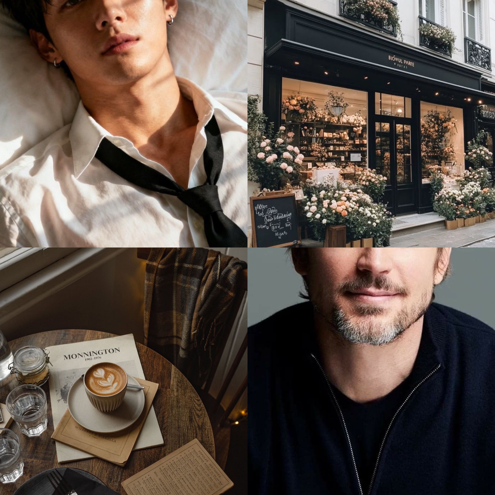 Pour représenter mes personnages, leurs passions, leur vie, etc., je réalise des montages dits aesthetic que je partage sur mes réseaux sociaux afin de donner à mes lecteurs un aperçu de mes livres. Si vous ne les avez pas vus, vous pouvez maintenant le faire ici ! (Cliquez sur l’image de votre choix pour l’agrandir.)